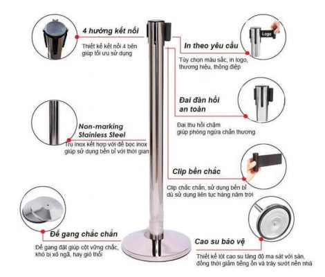 Sản phẩm chuyên dụng để phân làn, điều hướng lối đi cho người đi bộ. Nhờ có cột chắn inox này mà những nơi như cổng soát vé, quầy check in, quầy bán vé ở sân bay, nhà ga, bến tàu được đảm bảo trật tự. Không còn tình trạng chen lấn, xô đẩy, không xếp hàng ngay lối nữa. Trang bị trụ phân cách inox giúp hành khách biết được phương hướng di chuyển ra ga tàu của mình.