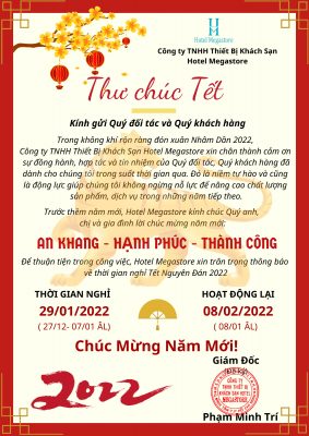 Trong không khí rộn ràng đón xuân Nhâm Dần 2022, Công ty TNHH Thiết bị khách sạn Hotel Megastore xin chân thành cảm ơn sự đồng hành, hợp tác và tín nhiệm của Quý đối tác, Quý khách hàng đã dành cho chúng tôi trong suốt thời gian vừa qua. Đó cũng là niềm tự hào và động lực giúp chúng tôi không ngừng nỗ lực để nâng cao chất lượng sản phẩm, dịch vụ trong những năm tiếp theo.